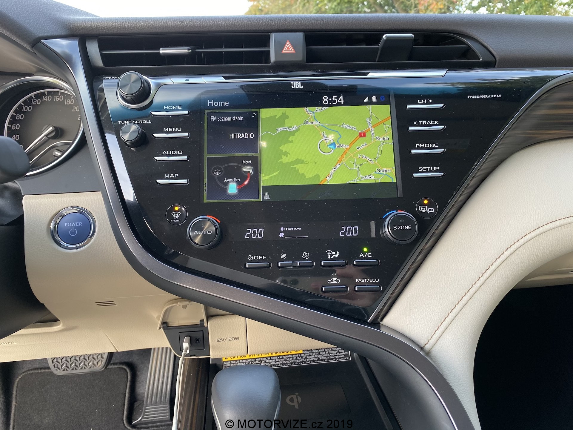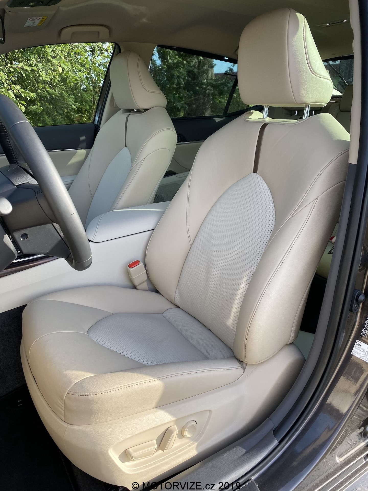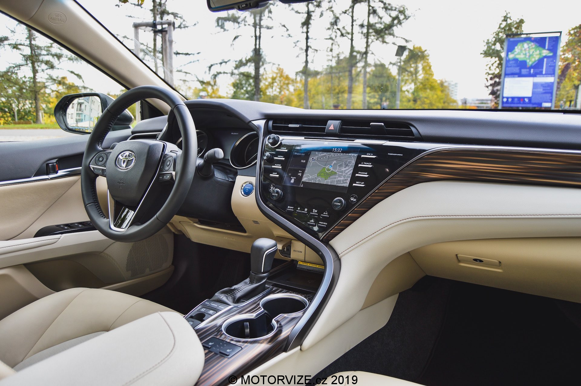 Dobře umístěná zrcátka na druhou stranu vyžadují pochvalu za minimální omezení výhledu ven. Nalezení polohy je díky všemožně nastavitelným sedadlům relativně snadné a elektricky ovládaný volant lze nastavit stejně tak snadno. Spousta tlačítek na středové konzoli působí trochu staromilsky, ale jejich popisky jsou jasné a k Toyotě to sedí. Strádat nebudou ani ostatní pasažéři. K dispozici je třízónová klimatizace, spolujezdec má stejný rozsah nastavení sedadla jako řidič. Ale vzadu! Tam je to překvapení. Za příplatek (v rámci balíčku VIP za 100 tisíc Kč) lze mít ve středové opěrce zadních sedadel ovládací panel jako pro ředitele. Ze zadních sedadel lze elektricky ovládat sklon opěradel, teplotu pro zadní řadu, roletku na zadním okně, ale dokonce i hlasitost rádia a jeho zdroj hudby. Místa v podélném směru je dost, nad hlavou se trochu projeví snižující se střecha, ale i tak – světlý interiér a prosklená plocha dělají ze zadních míst příjemné místo na cestování. A co teprve zavazadlový prostor. 524 litrů je na hybridní sedan této třídy velmi rozumná hodnota, kterou nesnižují baterie jako je tomu u konkurentů, protože v Camry jsou pod zadními sedadly.