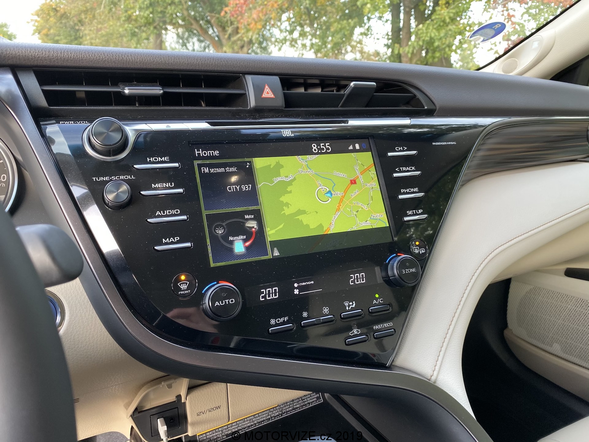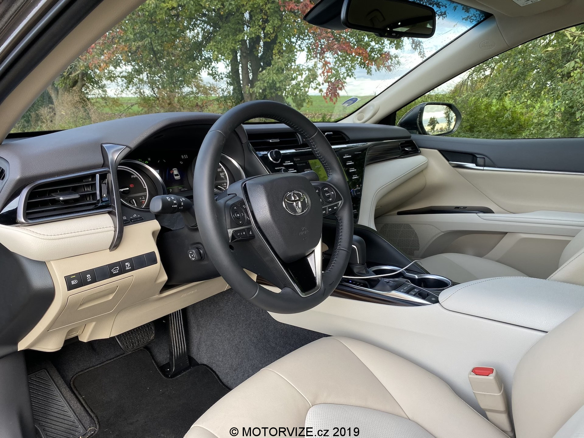 Dostáváme se k největší slabině Camry a tou jsou elektronické systémy – nelze pochválit obtížné ovládání navigace v palubním menu, ani postarší systém palubní zábavy a jeho uživatelské rozhraní. K dobru budiž velmi dobré dopravní informace o zácpách (nedělní kolony na D1 oznamovala dobře a čas dojezdu také) a zobrazování pokynů na head-up displeji (v rámci příplatkového balíčku VIP). Ani technicky není infotainment bůhví co – konkurenti mají obrazovky větší, jemnější a s rychlejšími odezvami. A nedostupnost CarPlay nebo Android Auto také nepotěší, protože tyto aplikace dokážou nepovedený infotainment nahradit známým prostředím mobilního telefonu. Nutno říci, že Toyota slibuje, že tyto dvě technologie dodá v řádu měsíců. Situaci zachraňuje displej mezi budíky tvořící alespoň částečně digitální přístrojový štít, na kterém lze zobrazit řadu informací pomocí ovladače na volantu, jehož ovládání je přehledné a pochopitelné. Z místa řidiče tak zaujmou celkem tři displeje – 7palcový displej mezi budíky, 8palcový infotainment a 10palcový head-up displej promítaný na čelní sklo.