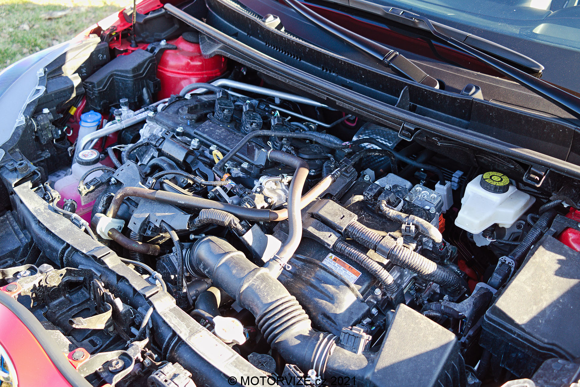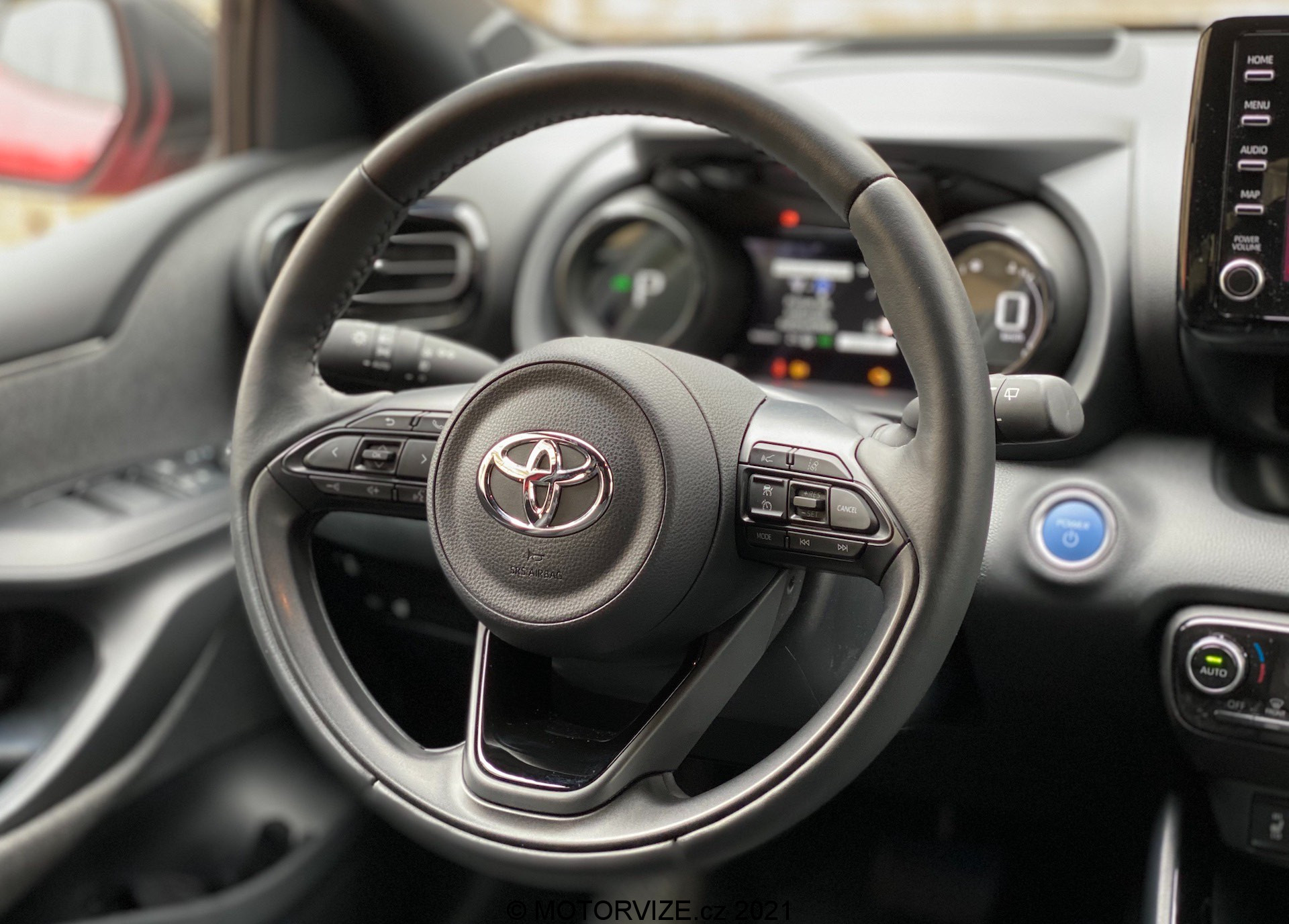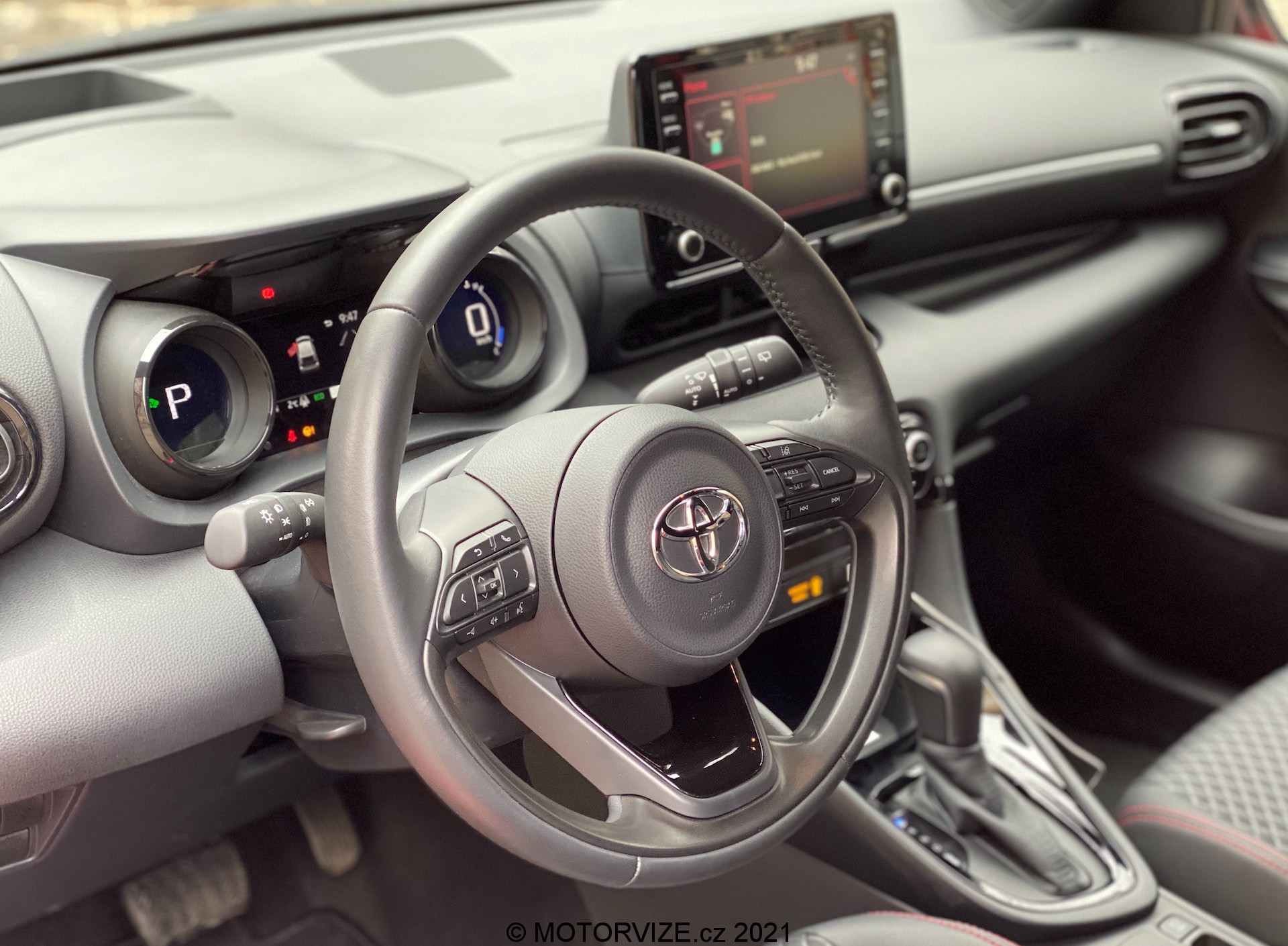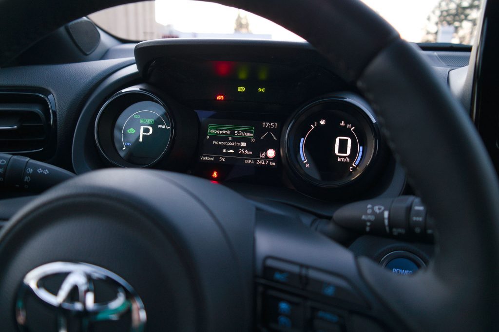 Asi nejvýznamnější devizou nového Yarise je až překvapující jízdní komfort, který je na takto malý vůz opravdu nadprůměrný. Toyota Yaris 4. generace disponuje pro tento segment standardní sadou odpružení a zavěšení kol, tedy MacPherson na přední nápravě a vlečená ramena s torzní tyčí na té zadní. I přes obutá 17“ kola se Toyotě podařilo naladit podvozek a vybrat odpovídající sadu pneumatik tak, že se auto chová velmi stabilně a zároveň dokáže filtrovat velice obstojně i výraznější jak příčné, tak i podélné nerovnosti na vozovce. V našem testovacím exempláři byla osazena ceníkově nejdražší motorizace v nabídce tohoto modelu, tedy hybridní pohonná jednotka “Hybrid Synergy Drive–HSD” kombinující benzinový, atmosférický tříválec “Dynamic Force” o objemu 1,5 litru o maximálním výkonu 92 koní, se synchronním elektromotorem skrze elektronicky řízenou převodovku s plynule měnitelným převodem (e-CVT). Oba motory jsou uloženy nad přední nápravou a jejich maximální systémový výkon činí 116 koní. Elektromotor čerpá energii z inovovaného lithium-iontového akumulátoru uloženého na zadní nápravě vozu. V praxi se tak nový hybridní Yaris spoléhal ve městě přibližně v 50 procentech případů čistě na elektrický pohon. Na okreskách a na dálnicích už pak pracoval systém v součinnosti obou motorů, a tak se dle čísel spotřeby nejvíce autu “líbilo” v městském režimu, kdy se spotřeba spalovacího motoru držela velice nízko, okolo 3,8 až 4,5 litrů na 100 km. Během cest po okresních cestách, kde jsme se pohybovali předpisovou rychlostí přibližně 90 km/h, se vytížení benzinového motoru a s ním i jeho žízeň přirozeně zvětšily a na přístrojovém štítu jsme nejčastěji registrovali čísla spotřeby 4,5-5,0 litrů na 100 kilometrů. Vzhledem k povaze tohoto ústrojí byla spotřeba nejvyšší při jízdě dálniční rychlostí (120–130 km/h), při které její hodnota nastoupala a ustálila se na 6,4-6,5 litrech na 100 kilometrů. Na tomto příkladu je naprosto jasně vidět největší slabinu hybridního pohonu. Nevyhnutelně se mi tak hybrid od Toyoty v tomto voze nejvíce osvědčil při jízdě městem, maximálně v jeho přilehlém okolí. Jedině v tomto režimu by se jeho provoz mohl eventuálně za několik let jeho užívání vyplatit (nutno dodat, že rozdíl mezi cenovkou hybridního pohonu a nejvýkonnější benzinové motorizace s manuální převodovkou je nemalých 90 000 Kč, v případě automatu pak 50.000 Kč). Pokud byste tak zatoužili po Yarisu s pohonem HSD, za smysluplnou se tato volba dá označit pouze v případě, že budete trávit převážnou část svých cest v městském provozu. Navíc v rychlostech od cca 100 km/h začíná již výrazněji vstupovat do kabiny aerodynamický hluk, projevující se jako svištivý zvuk linoucí se z bočních oken, způsobený zejména masivními zpětnými zrcátky a také výrazným reliéfem bočního profilu karoserie, který sice vypadá skvostně, ale nebude zřejmě nejaerodynamičtějším řešením. Poslední poznámka, kterou bych zde rád uvedl, se týká řízení. To mně přišlo u nového Yarisu spíše mdlejší (zejména ve střední poloze volantu) a osobně bych si u takto malého a poměrně hbitého městského auta uměl představit o něco strmější převod. Ten by mohl umocnit radost z jízdy, která by k takovému příměstskému vozítku dle mého názoru jistě patřila. A teď snad jen zbývá dodat, že z jízdního projevu nového Yarisu nejsem vyloženě zklamaný.