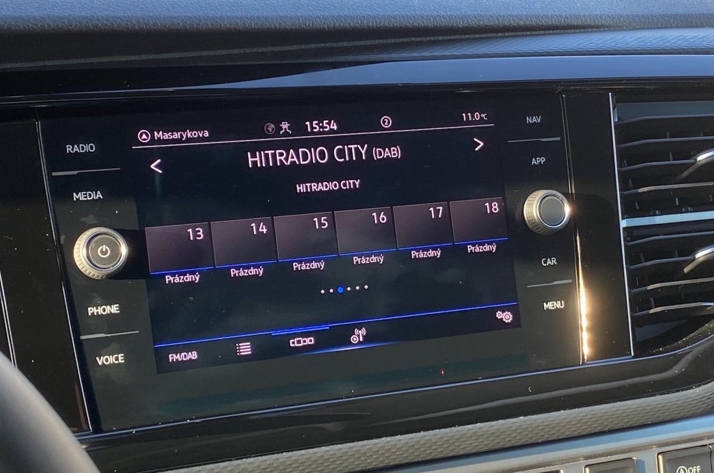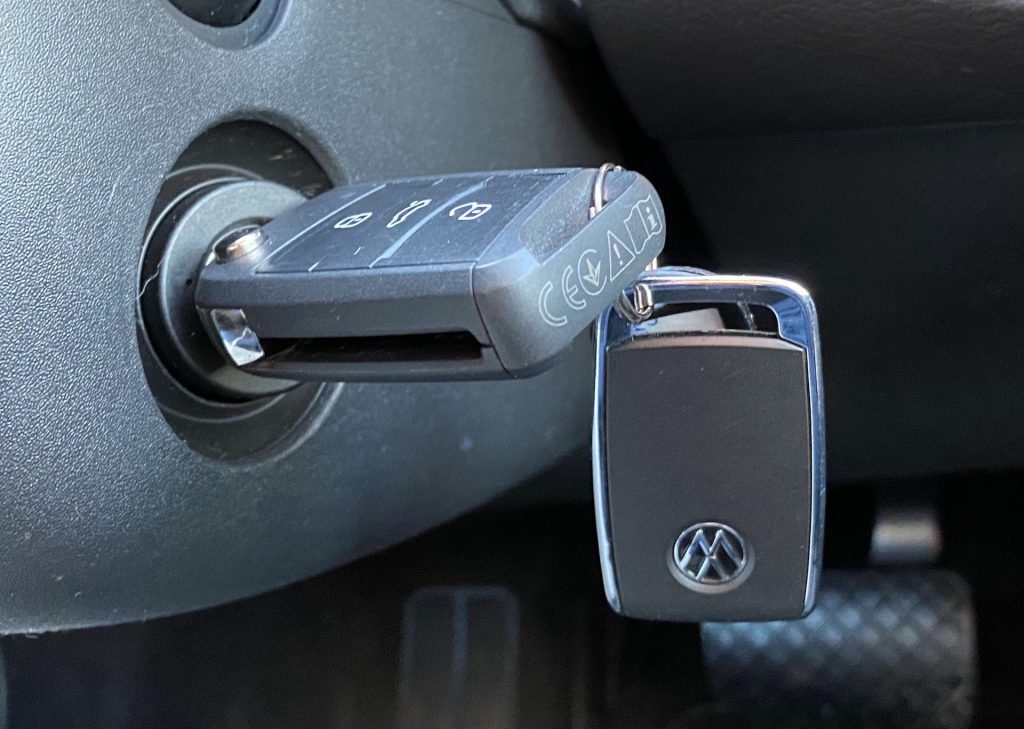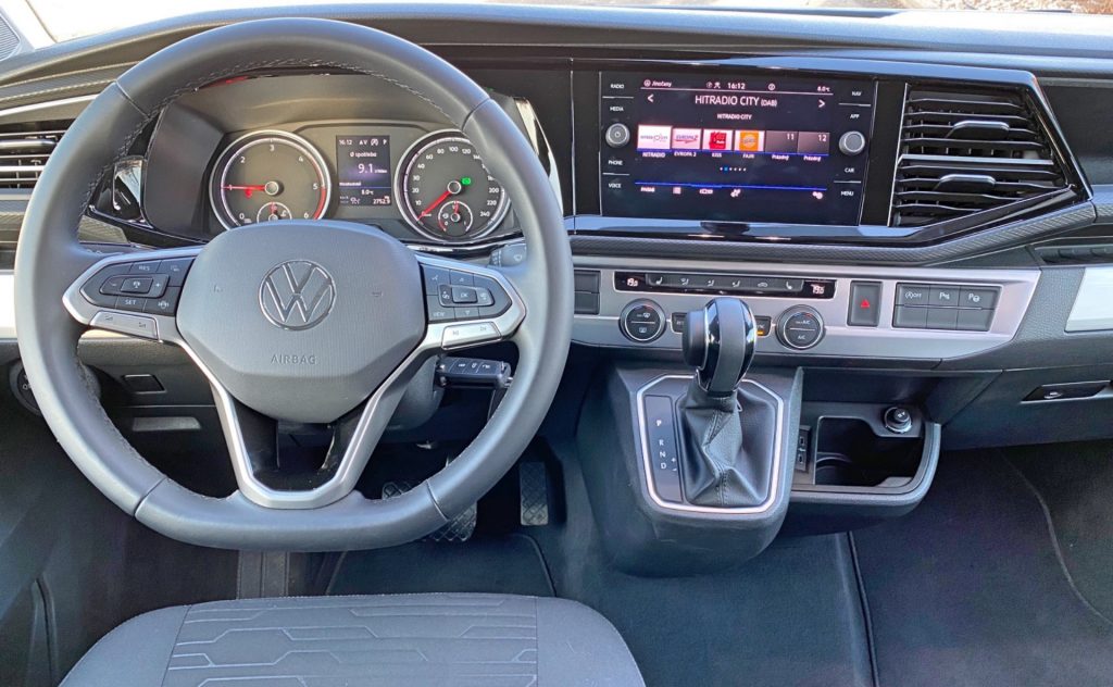 Poprvé nastupuji a překvapen jsem ihned, jelikož sedačky čalouní v našem případě „pouze“ základní látka. V konfigurátoru pak zjišťuji, že VW v tuto chvíli nenabízí Alcantaru ani kombinaci kůže s látkou. Alternativu tak představuje pouze „microfleece“ látka či plnohodnotná kůže. Posez i přes relativně hrubou základní látku považuji za velmi příjemný, na řízení doslova ideální. Sedačku si můžete nastavit dle libosti, u volantu bych pak uvítal větší rozsah v nastavení výšky a vzdálenosti. Základní analogové budíky v kapličce přístrojů doplňuje pouze standardní a dnes už relativně malý palubní počítač (barevný). Útěchou k palubnímu počítači může být velký středový displej infotainmentu. Pod ním se bohužel nachází pouze USB-C konektory. Osobně stále používám standardní USB 3.0 a v případě koncernu VW narážím snad u každé novinky – tady navíc neexistuje alternativa v podobě bezdrátové nabíječky. Navígační systém Discover Media Plus naštěstí nabízí Apple CarPlay s bezdrátovou konektivitou, takže jsem jednoduše mohl zůstat připojen do té doby, než se mi vybil telefon. Když se zastavím, podívám se na palubní desku a vlastně celou přední část auta, musím bohužel konstatovat, že si připadám spíše jako v užitkové verzi tohoto vozu – snad kromě nejvyšší řady infotainmentu s příjemně velkým skleněným displejem a komfortního tvaru sedadel nic dalšího nenapovídá, že sedíme ve voze za více než milion a půl. A pak je tu taky ten všudypřítomný klíček, který z nějakého nepochopitelného důvodu VW pro Multivan nechce / neumí nahradit bezklíčovou variantou přístupu (keyless entry). Tam, kde konkurence mnohdy alespoň pro účely startování nahrazuje už v základu klíč startovacím tlačítkem, VW archaicky nutí řidiče strkat klíč do zapalování.