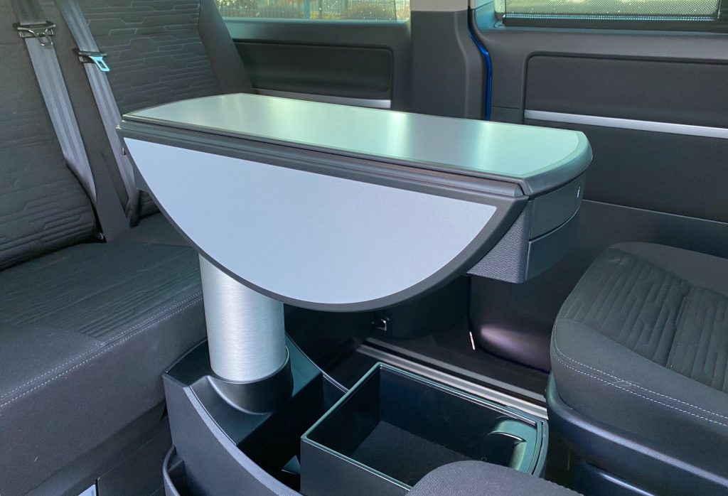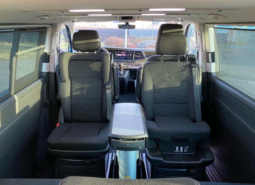 Přesuňme se ale do hlavní části – za řidiče a spolujezdce. Po nastoupení dozadu jsem si ihned všiml zvláštnosti sedačky. Byla to úprava na dětskou sedačku, kdy se sedák vytáhne nahoru, díky čemuž nemusíte stále přesouvat dětské sedačky a veškerá námaha padá. Dle mého je to v tomto autě v podstatě potřeba. Pokud si kupuje Multivan rodina, tak v 95 % případů bude mít početnější dětské osazenstvo. A tak tuto vychytávku po praktické stránce považuji za naprosto dokonalou. Poté nechybí možnost otáčení sedadel a ani boční opěrka na hlavu pro delší cesty. Já osobně jsem si vyzkoušel takový malý improvizovaný home office, resp. „car office“ – to je důvod názvu této části článku. V autě nechybí příplatkový posuvný stolek, který se dá složit a uložit mezi sedačky. Já osobně jsem musel v jednu chvíli hodně cestovat a v této době, kdy si nemohu sednout ani do kavárny, jsem byl velmi vděčný, že jsem nemusel sedět za volantem. Mohl jsem si příjemně sednout dozadu, roztáhnout si stolek a nastavit si jej tak, abych ho měl přímo před sebou, i když jsem seděl na levé zadní sedačce. A mohl jsem tu příjemně pracovat několik hodin. Sedět u notebooku tu nebylo nepříjemné a ani – jak bych řekl – otravné. Interiér (rozuměj především jeho zadní část), který si můžete navolit dle svých představ, mně osobně v této verzi velmi vyhovuje, jelikož vzadu nabízí 5 sedadel – za řidičem a spolujezdcem dvě sedadla otočitelná kolem své osy a naproti nim lavici pro 3, navíc jsou doplněná o zmiňovaný stolek ještě s držáky na pití a dalším úložným prostorem. Samozřejmě platí, že i v této specifikaci nabídne Multivan rozumný zavazadlový prostor, který je navíc možno přizpůsobovat individuálním potřebám, neboť zadní lavice nabízí podélný posuv.