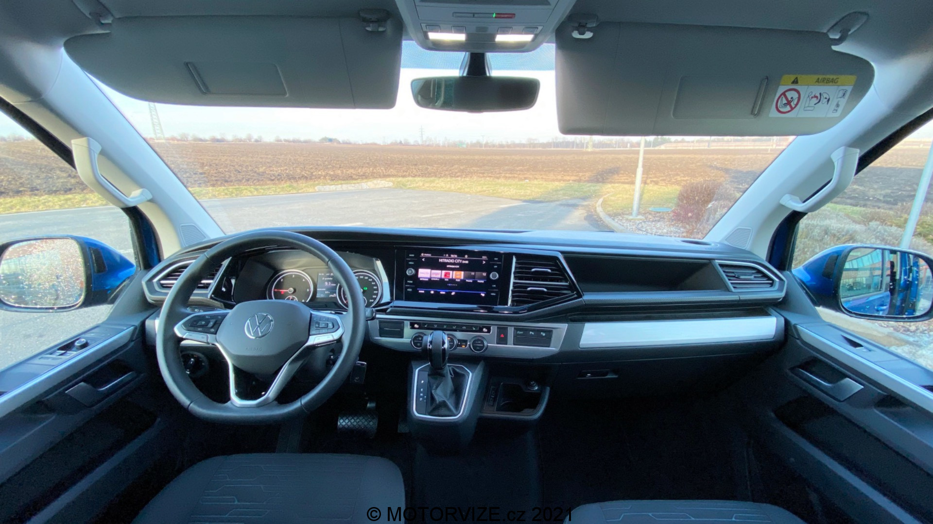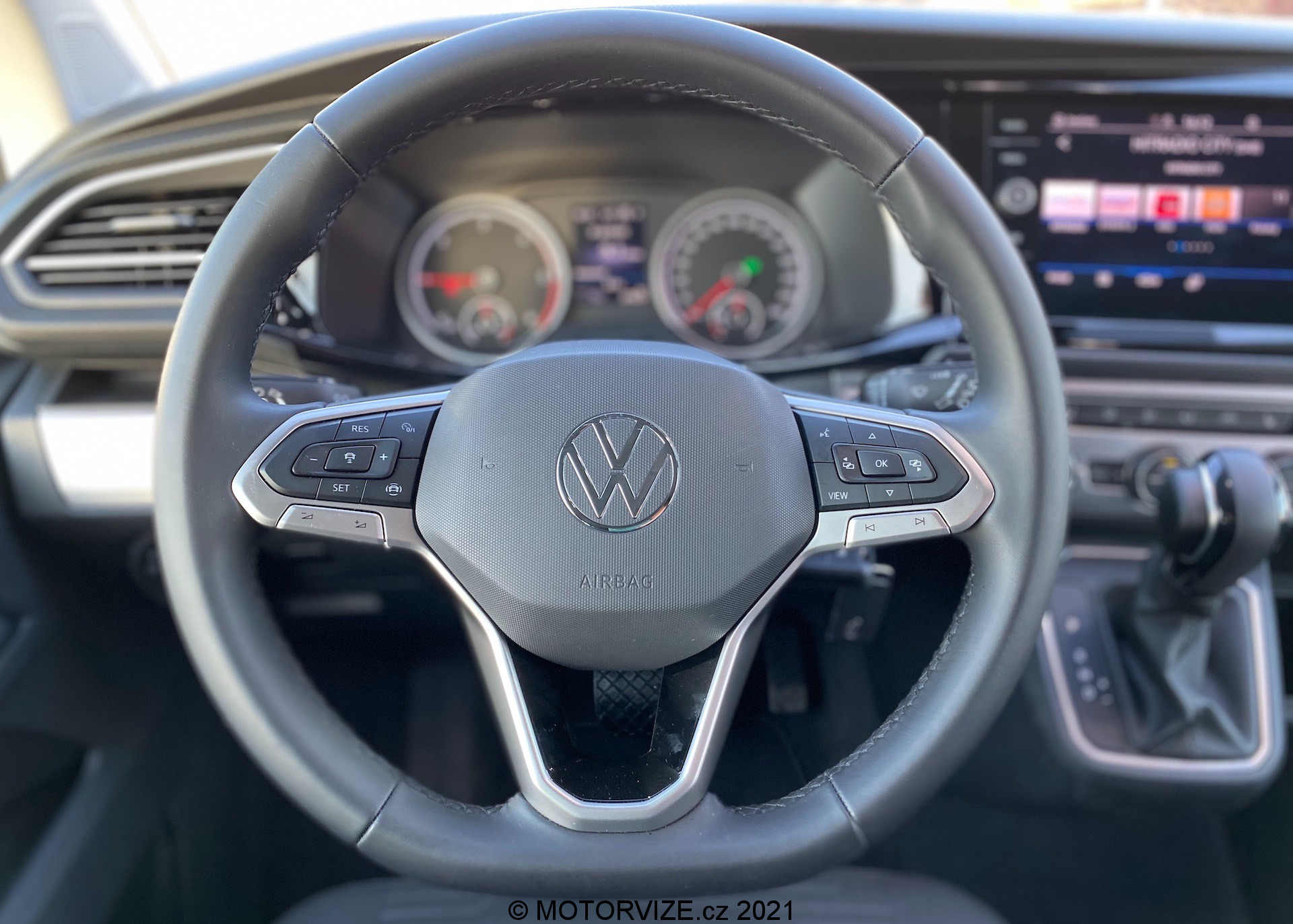 Poprvé nastupuji a překvapen jsem ihned, jelikož sedačky čalouní v našem případě „pouze“ základní látka. V konfigurátoru pak zjišťuji, že VW v tuto chvíli nenabízí Alcantaru ani kombinaci kůže s látkou. Alternativu tak představuje pouze „microfleece“ látka či plnohodnotná kůže. Posez i přes relativně hrubou základní látku považuji za velmi příjemný, na řízení doslova ideální. Sedačku si můžete nastavit dle libosti, u volantu bych pak uvítal větší rozsah v nastavení výšky a vzdálenosti. Základní analogové budíky v kapličce přístrojů doplňuje pouze standardní a dnes už relativně malý palubní počítač (barevný). Útěchou k palubnímu počítači může být velký středový displej infotainmentu. Pod ním se bohužel nachází pouze USB-C konektory. Osobně stále používám standardní USB 3.0 a v případě koncernu VW narážím snad u každé novinky – tady navíc neexistuje alternativa v podobě bezdrátové nabíječky. Navígační systém Discover Media Plus naštěstí nabízí Apple CarPlay s bezdrátovou konektivitou, takže jsem jednoduše mohl zůstat připojen do té doby, než se mi vybil telefon. Když se zastavím, podívám se na palubní desku a vlastně celou přední část auta, musím bohužel konstatovat, že si připadám spíše jako v užitkové verzi tohoto vozu – snad kromě nejvyšší řady infotainmentu s příjemně velkým skleněným displejem a komfortního tvaru sedadel nic dalšího nenapovídá, že sedíme ve voze za více než milion a půl. A pak je tu taky ten všudypřítomný klíček, který z nějakého nepochopitelného důvodu VW pro Multivan nechce / neumí nahradit bezklíčovou variantou přístupu (keyless entry). Tam, kde konkurence mnohdy alespoň pro účely startování nahrazuje už v základu klíč startovacím tlačítkem, VW archaicky nutí řidiče strkat klíč do zapalování.