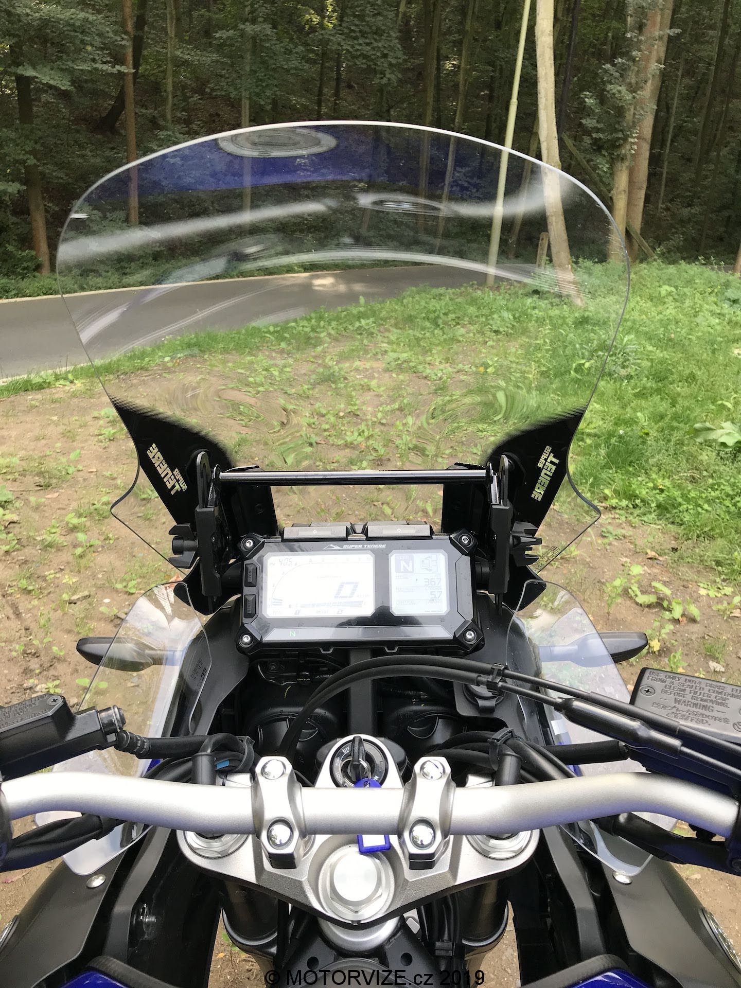 Super Tenere vypadá přesně tak, jak chcete. Jako by zrovna přijela ze závodu. Jen je čistá, což se o ní po několika dnech, kdy jsem se s ní proháněl všude, kde zrovna nebyl zákaz vjezdu, rozhodně nedá říct. Na první pohled zaujme výrazná maska s dvojicí předních světel a v raid edition ještě dvojicí přídavných světel. Ty v noci svítí do šířky přes tři pruhy a osvětlují vše, co potřebujete vidět. Nad tím vším máte vysoký štít s bočními deflektory vzduchu a přední kolo s bezdušovou pneumatikou určenou na silnici i do terénu. Modro-černá barevná kombinace s perfektní grafikou, bílými nápisy a karbonovými bočními panely se vyloženě povedla. Za předním štítkem je pracovní prostor řidiče. Ten má k dispozici široká řídítka nad velkou nádrží o objemu 23 litrů, což při spotřebě lehce pod 6 litrů dává úctyhodný dojezd přes 400 km. K zobrazení všech důležitých údajů jsou určeny 2 displeje. Levý (větší) zobrazuje informace o jízdě jako je rychlost, otáčky, nastavení trakce a motoru. Pravý (menší) slouží k nastavování podvozku, tlumičů, ujeté kilometry, provozní teplotu atd. Nad displejem se tyčí hrazda na navigaci a na pravé straně je pro ni rovnou připravená dobře přístupná zásuvka.