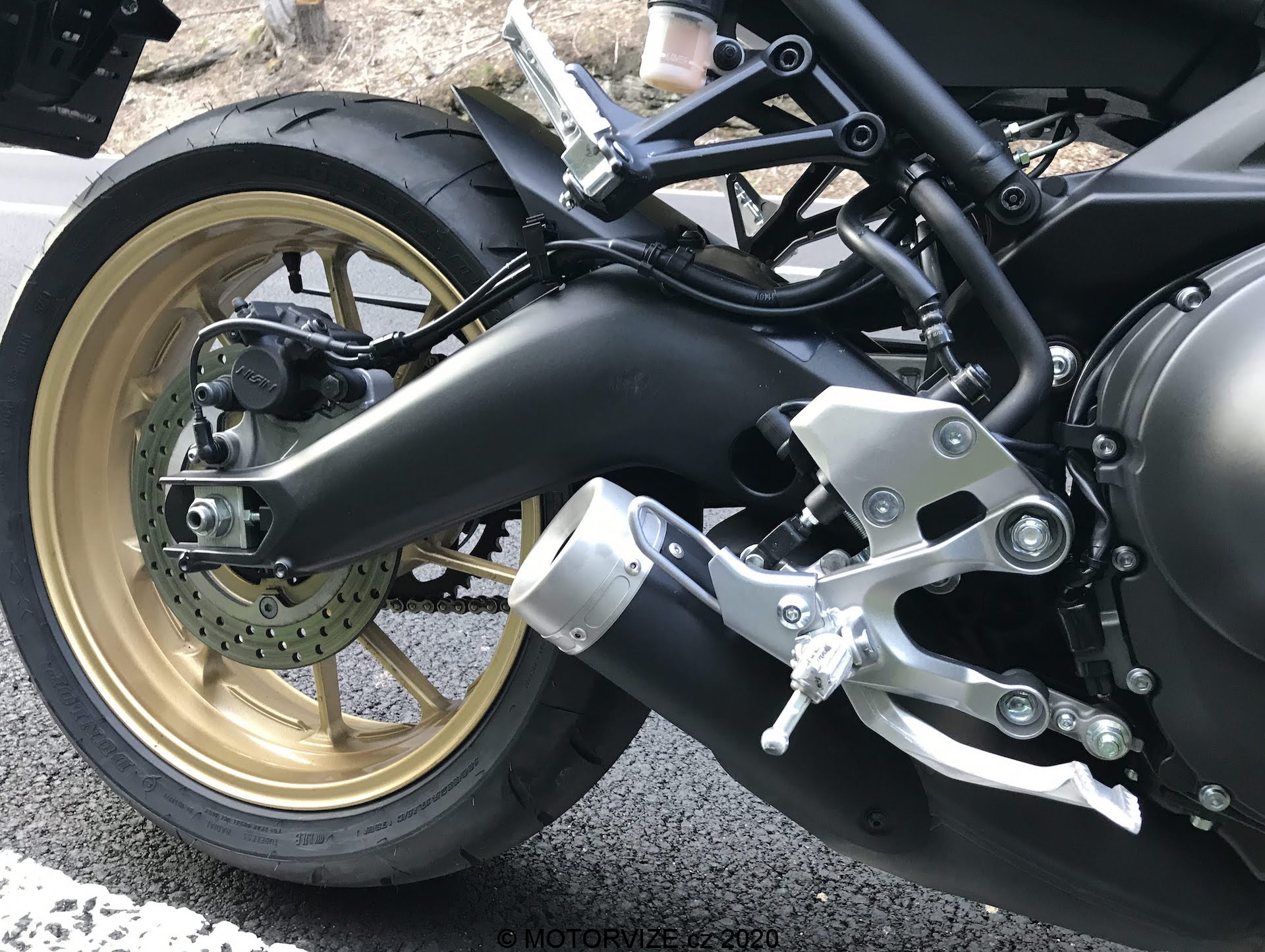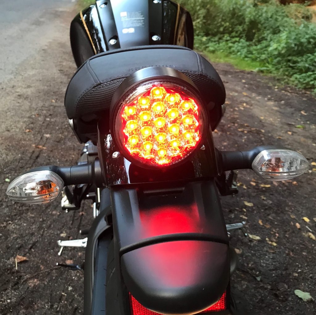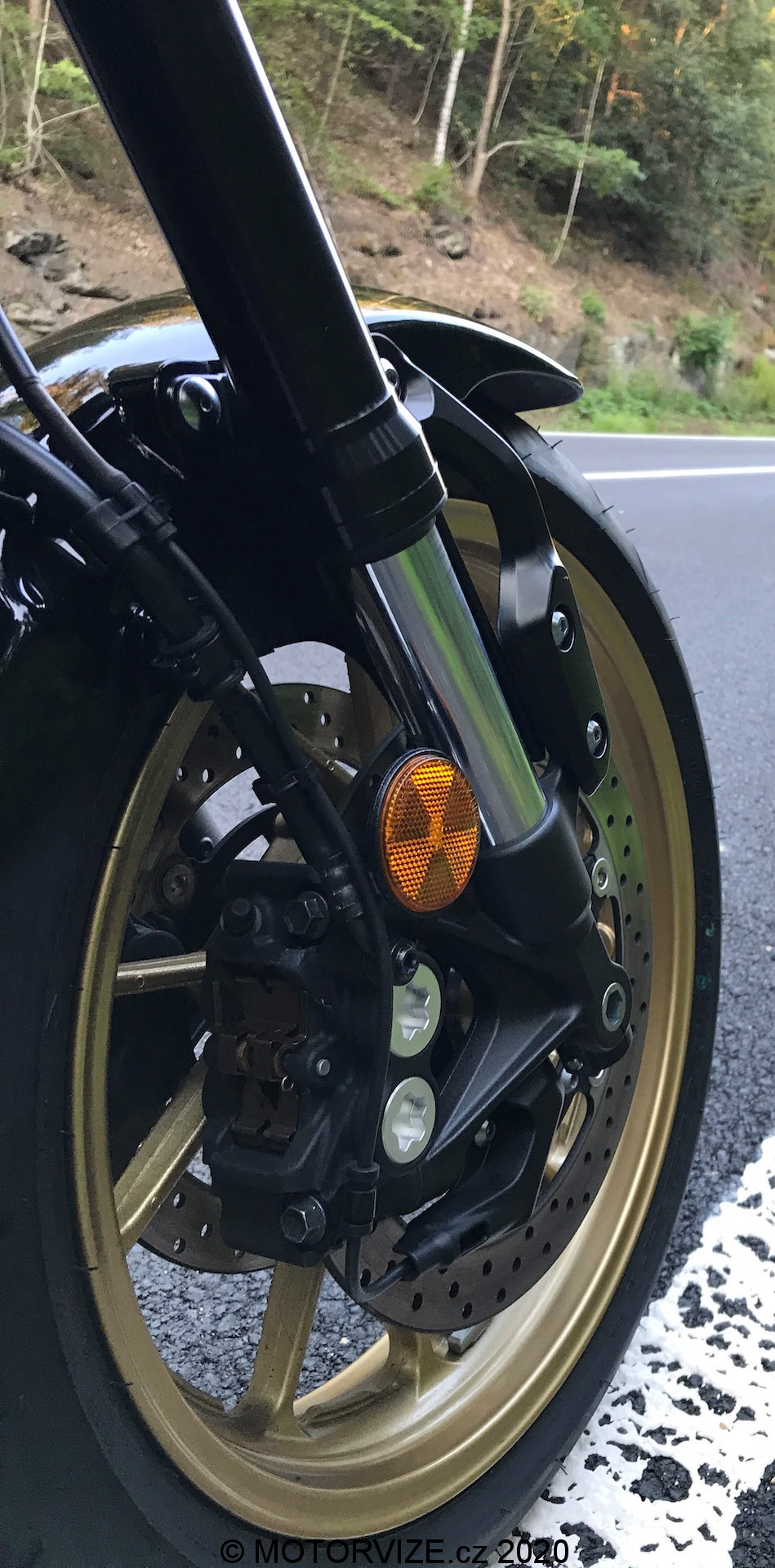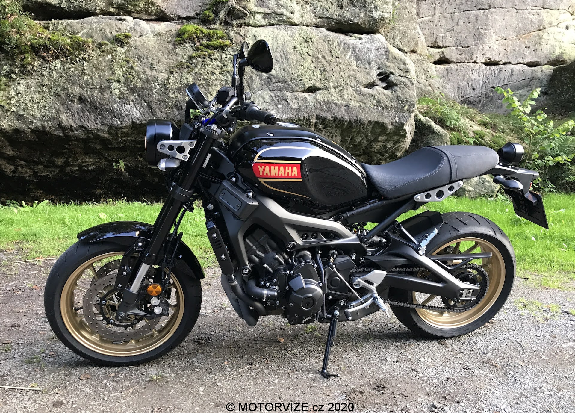Za prvé, barva. Od roku 2016 přichází Yamaha každý rok s novou barevnou kombinací a ani o jedné z nich se nedá říct, že by nebyla trefou do „černého“. Pro mě je asi nejvýznamnějším provedením žlutá k 60. výročí. Ale i barevná kombinace pro 2020 se mimořádně povedla. Na testování jsem dostal hned tu druhou kombinaci, tzv. „80 Black“ podle klasického schématu barev Yamaha z 80. let 20 století. Černá se zlatým proužkem je v kombinaci s výrazným nápisem Yamaha – který leží na červeném podbarvení – správně šmrncovní. Ostatní pýchy jejího designu jsou o mnohem menších detailech. Yamaha nešetřila na kvalitním kovu, a tím je styl téhle motorky doveden k dokonalosti. Jak by řekl fajnšmekr, „není to žádný plasťák“. Podíváte-li se na hliníkové kryty nádrže, držák předního světla, nebo třeba držák blatníku, stupačky, páky, držák budíku atd., všude najdete hliník, žádné plasty! To samé užití vidíme u šroubů na motoru a spojce, na krytkách a v dalších hlubších vnitřnostech tohoto stroje. Ten, kdo tuhle motorku navrhoval, věděl, co dělá a dává nám najevo, že to s odkazem na celou historii sportovních motorek od Yamahy myslí smrtelně vážně. Osobně se mi líbila i zadní lampa. Je na můj vkus sice trošku větší, a pozor je třeba si dávat při nastupování (aby nedošlo k ukopnutí), ale k téhle motorce prostě patří. Znovu připomínám, trochu retra se dalo ubrat na předním světle. Kovové držáky, jak u světel, tak na přístrojových deskách (takový kulatý displej, který klasický budík povznesl do 21. století), všechny tyto nutné doplňky jsou dovedeny k perfektnosti. Očividným problémem ovšem je, že retro technologii Yamaha použila i uvnitř světla. Chápu, design je jedna věc – na které si výrobce zakládá – ale raději bych měl retro obal s pořádným LED světlem než tu „světlušku“, kterou do předního světla dala Yamaha. To samé platí s blinkry… I když tam se dá za pár peněz koupit moc hezký upgrade na LEDky.