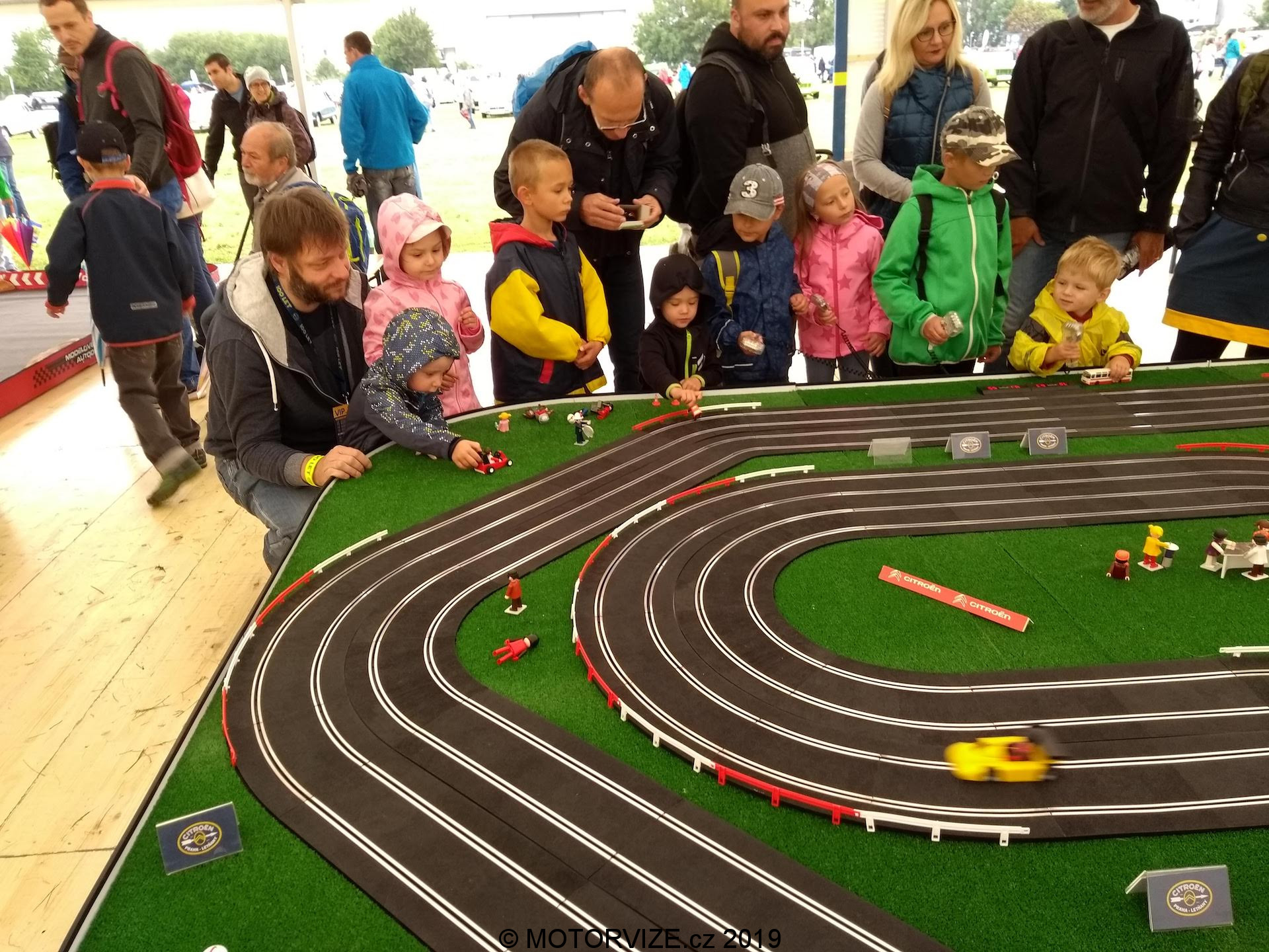 Takže zpět z historie k oslavě stoletého výročí Citroënu. Ta probíhala společně se dnem letiště Letňany právě v okolí. Bohužel ranní počasí nebylo úplně přívětivé k venkovní akci a ani předpověď nevypadala zcela příznivě. Po příjezdu na místo těsně po desáté hodině jsem byl vcelku překvapen, jak velké množství lidí si v sobotu přivstalo, aby se přijelo podívat na tuto oslavu. A nebyli to pouze fanoušci značky, i když na přilehlém parkovišti bylo právě všech různých Citroënů nespočet. Pravda, i já jsem si s sebou vzal celou rodinu, protože doprovodný program sliboval vyžití i pro rodiny s dětmi. Po zaparkování a registraci jsme si prohlíželi řadu veteránů značky hned za vstupní branou. Už při pohledu na tato auta vlastně zjistíte, jak jsou ta dnešní veliká a jak byla dříve malá. Při obcházení veteránů se nám trošku rozpršelo, tak jsme šli do „dětské“ zóny, kde si prcci mohli vyzkoušet ovládání malých Citroënů 2CV v meřítku 1:10 na dálkové ovládání. Legrační bylo, že i ty modely měly autentický kývavý pohyb jako skutečná kachna. Popravdě to dětem moc nešlo, protože na takováto auta jsou ještě malá, ale očividně je to bavilo, teda hlavně bourat. Asi budu muset oprášit svoje staré RCéčko ve stejném rozměru, aby mohli trénovat. Další atrakcí byly dvě čtyř-dráhové autodráhy – jedna pro větší děti, kde byla autíčka docela rychlá – teda 3 Citroeny v současných i historických továrních barvách značky a jedno Ferrari, které bylo na dráze nejpomalejší a neustále se ho muselo pošťuchovat, aby jelo. To je jako ve skutečnosti, italská auta jsou hezká… A druhá autodráha, ta se mi líbila ještě více, byla i pro naše prcky, auta neměla tvar žádné značky, ale vozili se v nich Igráčci. Jé, co já se s nimi nahrál jako malej kluk, a o to víc mě těší, že se už zase vyrábí, navíc v mé rodné vísce střediskové. Mám velkou radost, že mají úspěch i u současných dětí mezi tou přehršlí ostatních hraček…
